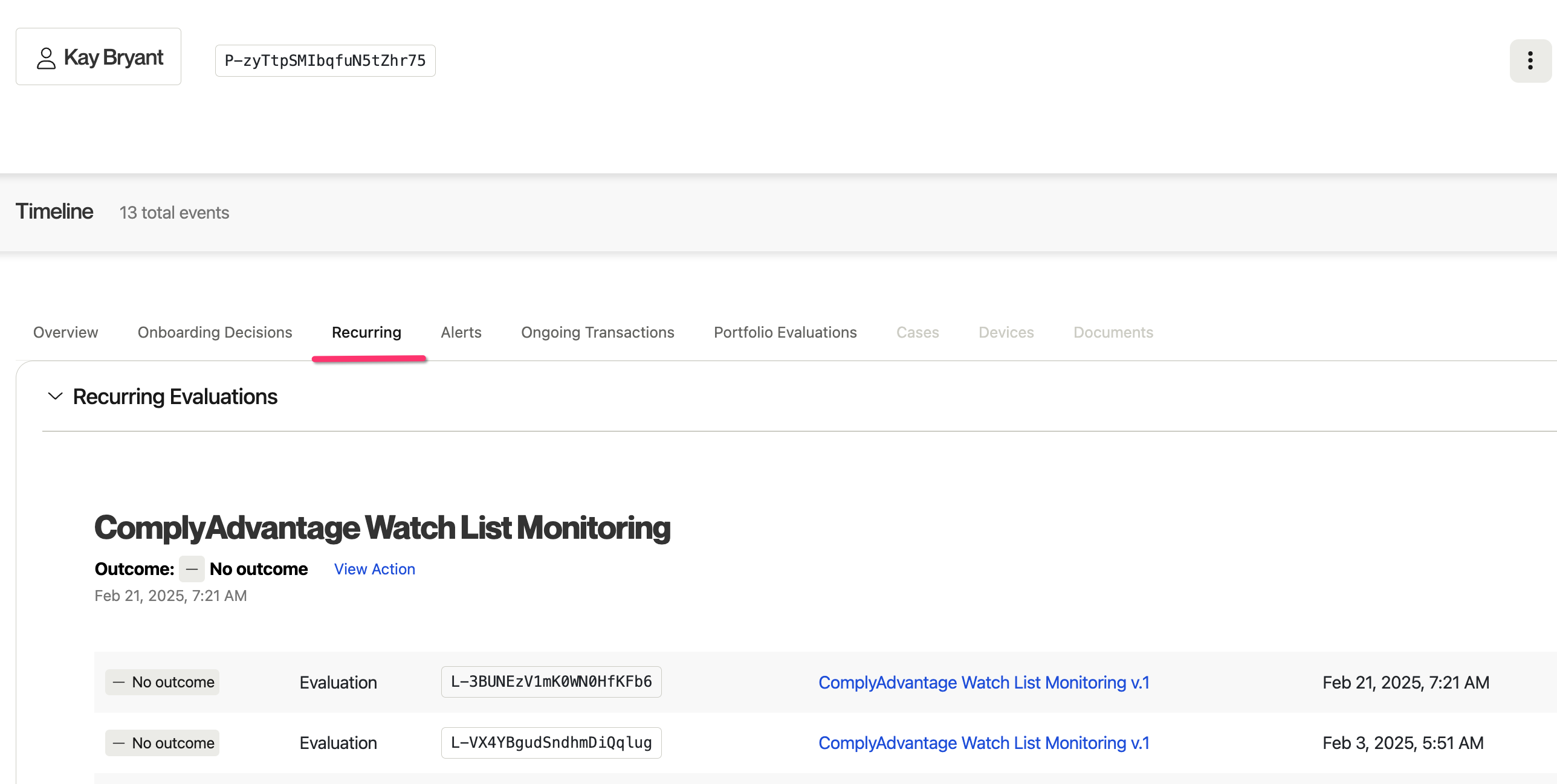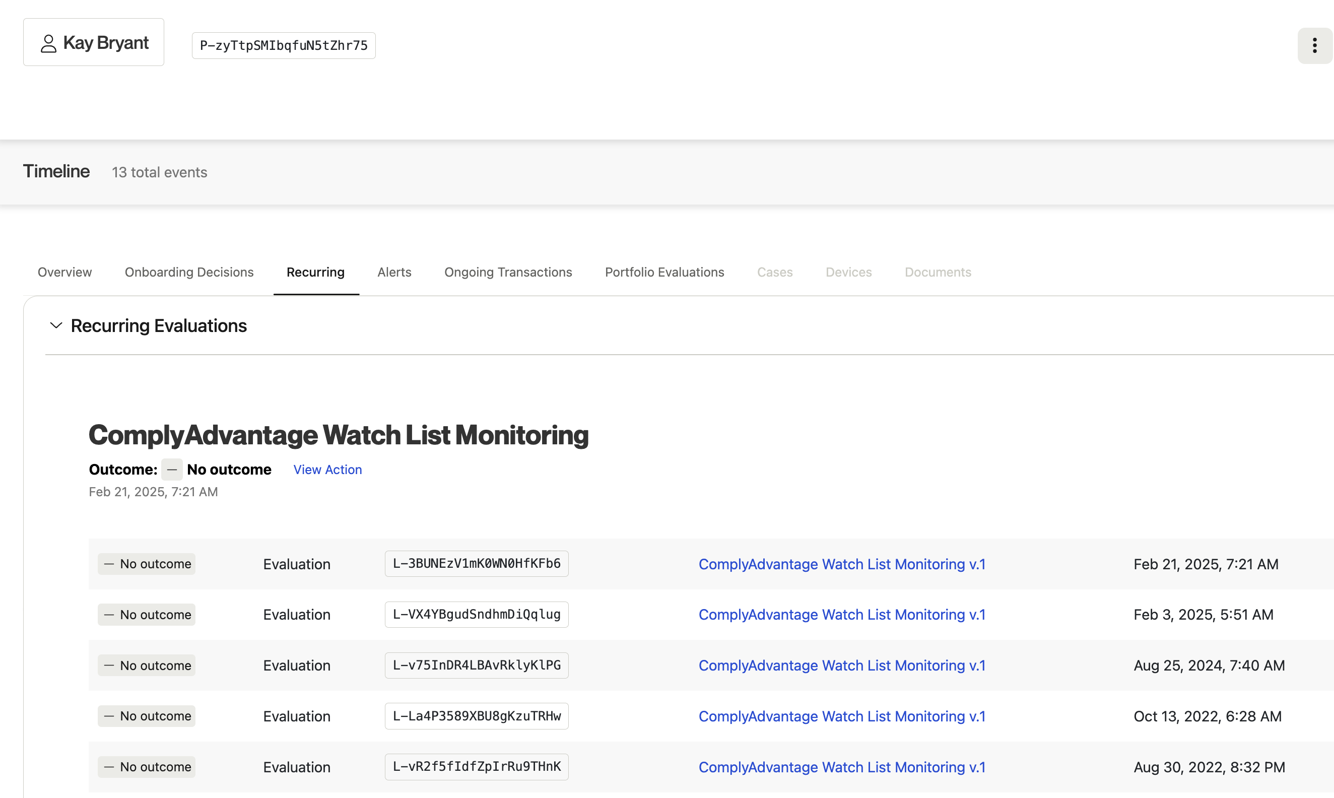Alloy creates a new evaluation every time there is a new hit on an updated watch list. These are housed on the entity profile page under the new Recurring tab.