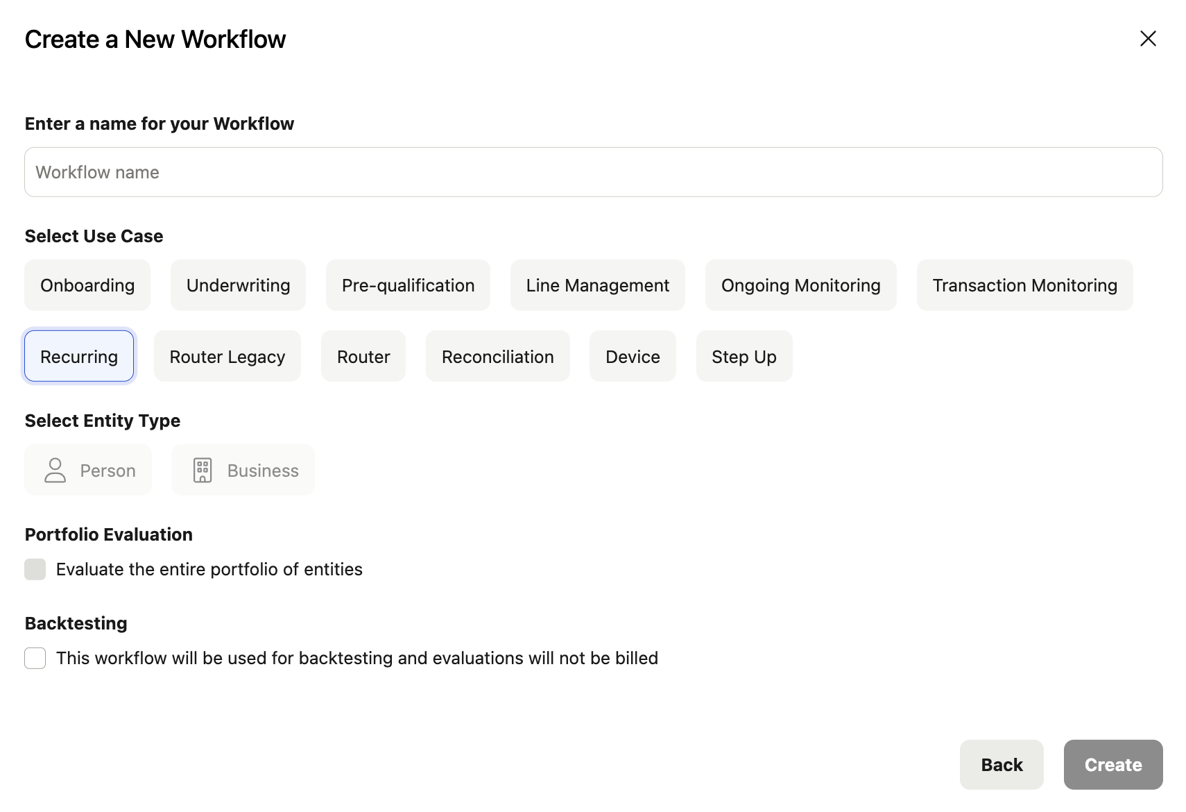Choose the Recurring workflow you previously created. These services in this initial onboarding workflow will perform an initial screening for a given entity and enroll them in ongoing monitoring.