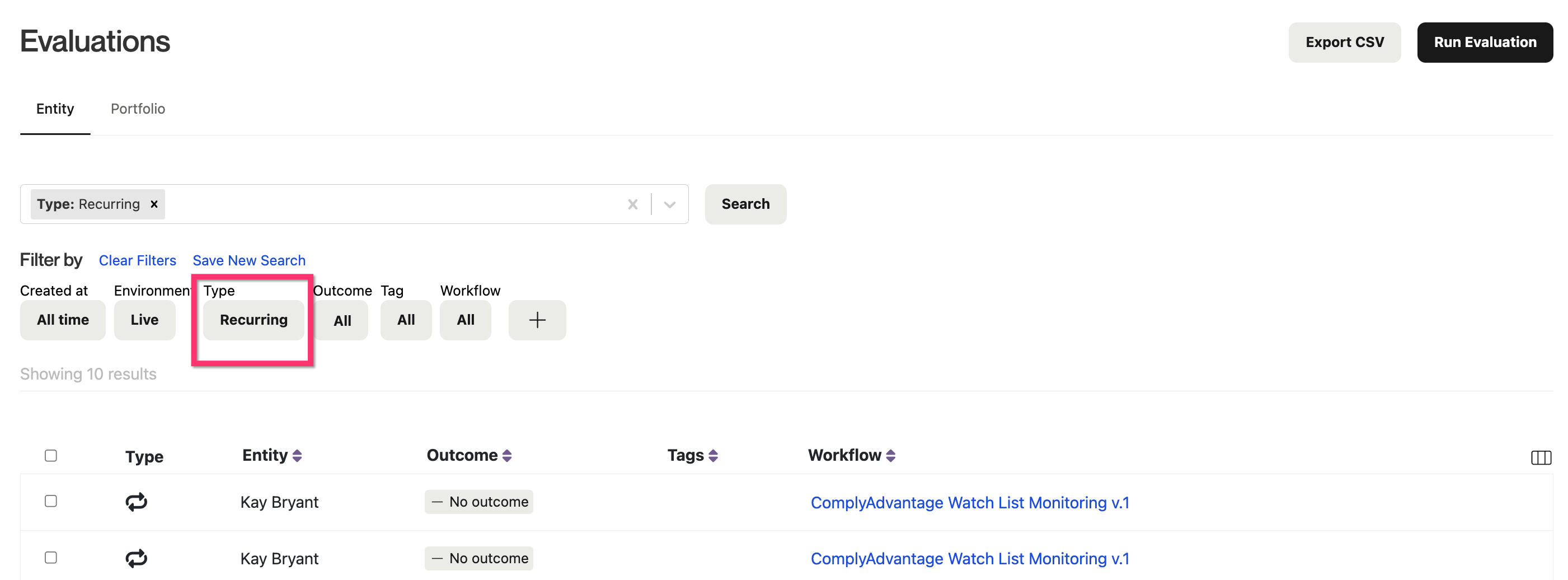 A recurring evaluation will only show the net new watch list hit for review.