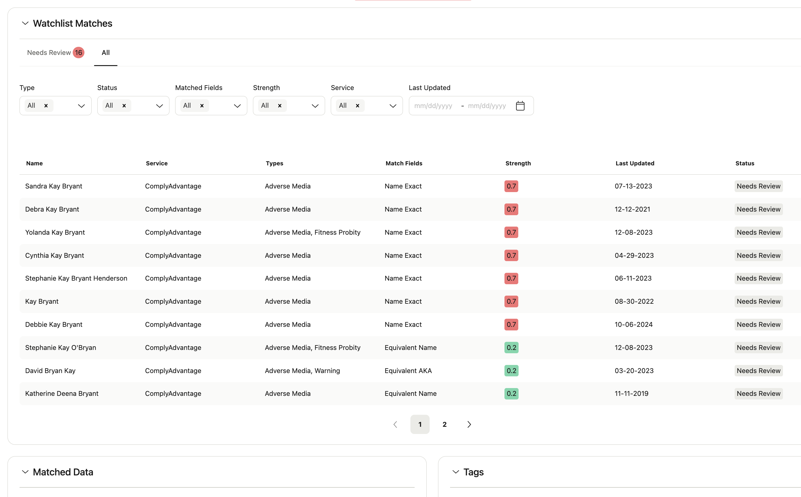 Assuming tags and outcomes have been configured in the recurring workflow, new ongoing watch list evaluations will appear in the Review Queue for analysts to manually decision. Clients can also configure a new review queue for analysts to review new hits.