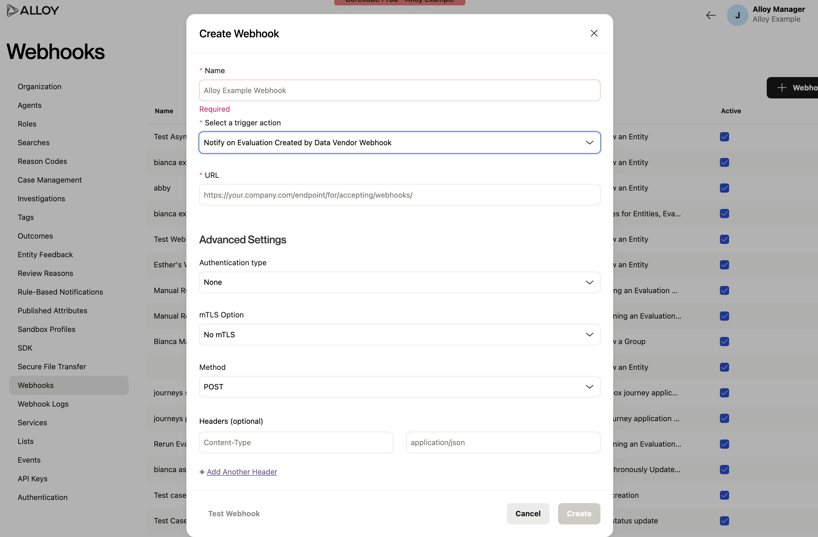 If a user would like to set up a webhook so they can be notified of new ongoing watch list hits, they can configure this by creating a new 'Notify on Evaluation Created by Data Vendor Webhook' in Settings > Webhooks. The user should get webhooks from Alloy for recurring evaluations.